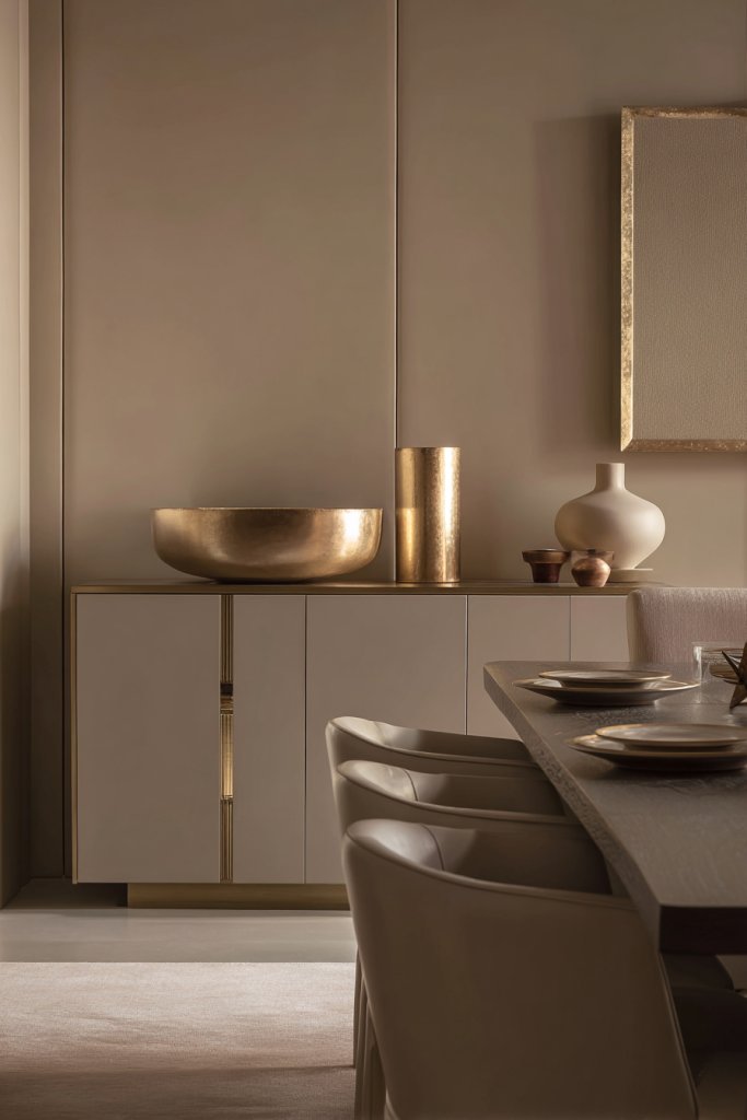 Visualize walls painted in warm beige or soft taupe, accented by gold or brass accessories. The metallics catch the light and add a touch of glamour, while neutrals provide a calm backdrop. Layering textures like matte, satin, and shiny finishes creates depth and sophistication. The overall effect is an elegant, balanced room that radiates serenity.