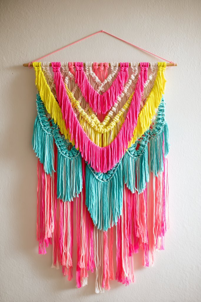 Picture a large wall adorned with a vibrant macrame piece, featuring bright cords in shades of turquoise, pink, and yellow. The textured knots and fringes create a tactile feast for the eyes, inviting you to reach out and touch. The knots form intricate patterns that catch the light differently throughout the day, adding depth and movement. The overall look is lively, cozy, and effortlessly artistic, transforming a dull wall into a statement.