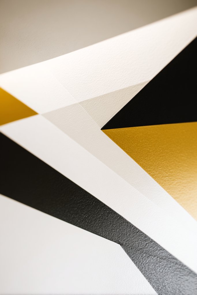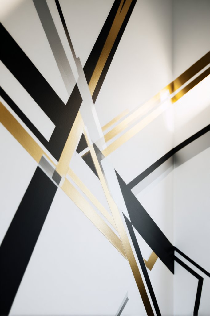 Imagine a wall featuring overlapping geometric shapes created with painter’s tape, where metallic gold and silver accents shimmer in the light. The shapes are layered, with some lines extending beyond the edges, creating a sense of movement and depth. The contrast between matte paint and shiny tape adds a sophisticated edge. The overall look is sleek, contemporary, and eye-catching.