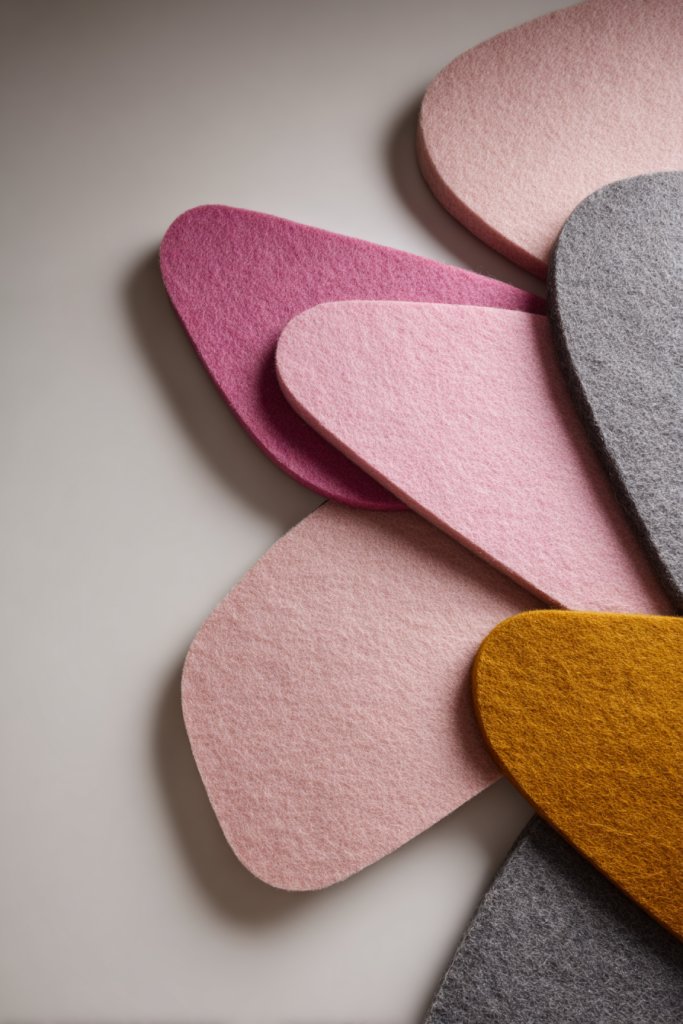 Imagine a wall adorned with layered felt shapes—circles, triangles, or organic blobs—in shades of blush, teal, and mustard. The soft textures create a plush, inviting surface, while overlapping layers add depth. The shapes can be arranged in a dynamic, asymmetrical composition or in a structured grid. The tactile quality invites touch and complements cozy interiors.