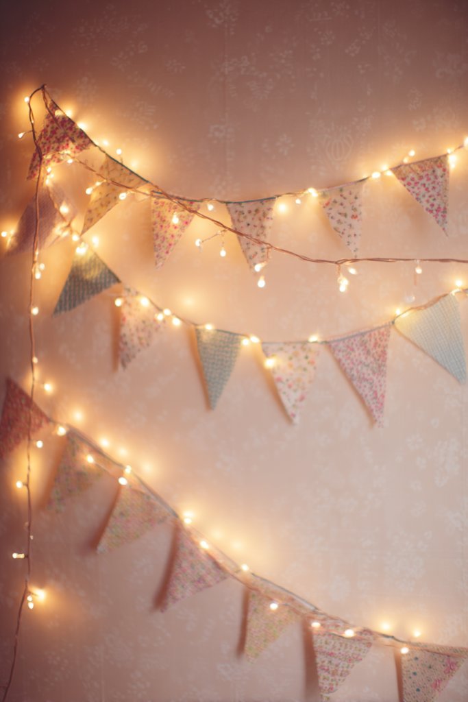 Picture a wall draped with a string of warm fairy lights intertwined with colorful fabric flags or paper pennants. The soft glow of the lights enhances the vibrant colors of the banners, creating a layered, textured look. The banners sway gently with air movement, adding a dynamic, festive feel. The overall effect is cheerful, cozy, and full of personality—ideal for gathering spaces or bedrooms.
