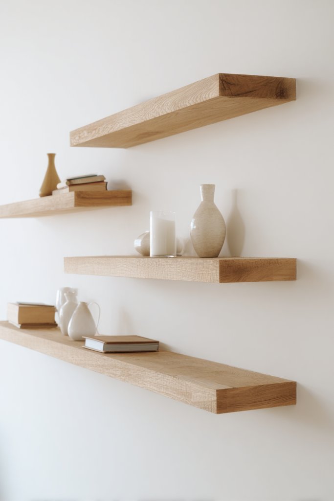 Imagine a set of floating wooden shelves in natural or painted finishes, holding carefully curated items like vintage cameras, candles, or small sculptures. The shelves’ clean lines and minimalist design make your decor stand out while maintaining a clutter-free look. Arranged asymmetrically or in a grid, they create a dynamic visual flow. The open storage invites curiosity and invites you to personalize your space.