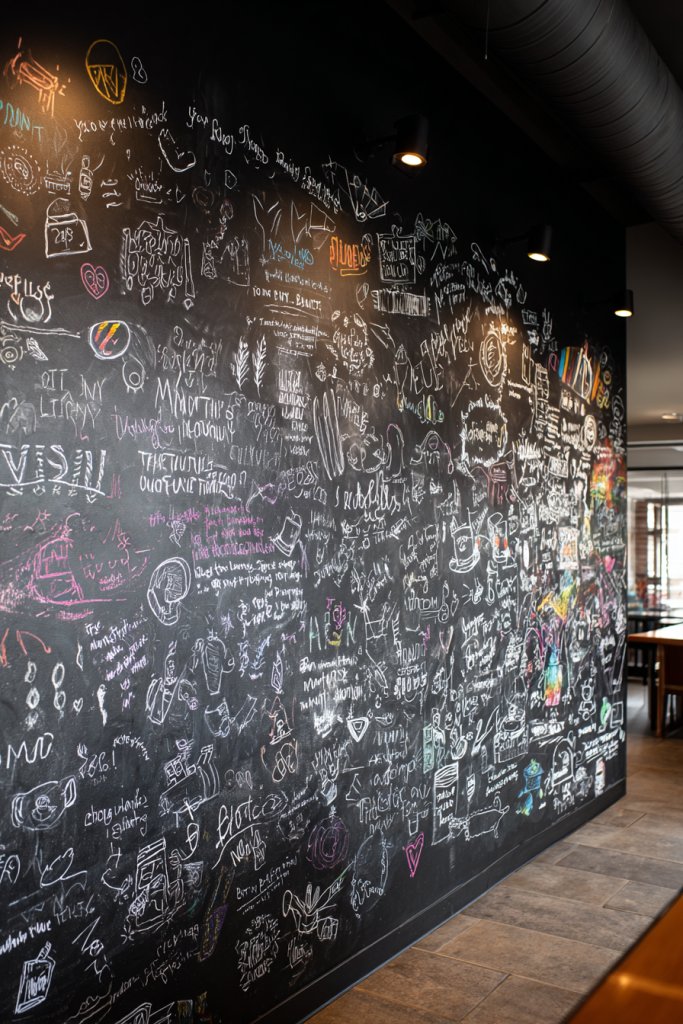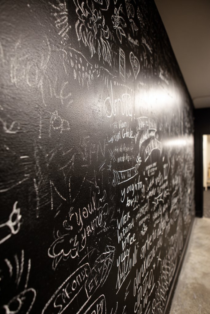 Imagine a wide section of your wall painted with matte black chalkboard paint, filled with colorful doodles, charts, or inspiring quotes. The chalk’s matte finish contrasts beautifully with vibrant chalk colors, creating a lively, ever-changing mural. Kids, artists, or busy parents can all contribute to the evolving design, making your space interactive and personal.