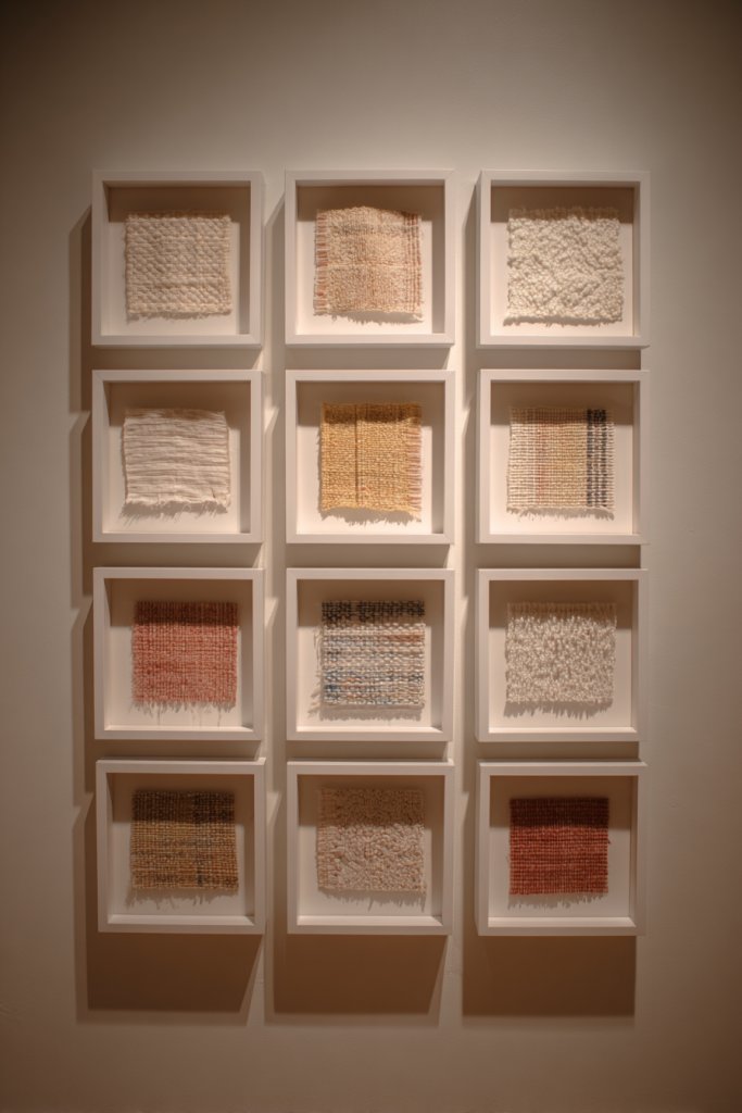 Picture a series of framed fabrics in various patterns and textures, arranged in a grid or eclectic layout. Think of a soft cream throw with chunky knit texture, a floral upholstery remnant, and a velvet piece in jewel tones. The fabrics are stretched over sturdy mats and framed in simple white or metallic frames. The mix of textures catches the light and invites touch, creating a rich visual tapestry.