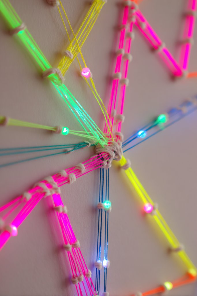 Visualize a wooden board with a geometric or word-shaped outline, filled in with colorful thread. Neon pinks, greens, and blues glow against the neutral background, creating a lively focal point. The raised string creates interesting shadows and a tactile element, making the art not just visual but inviting to touch. It’s playful, modern, and full of personality.