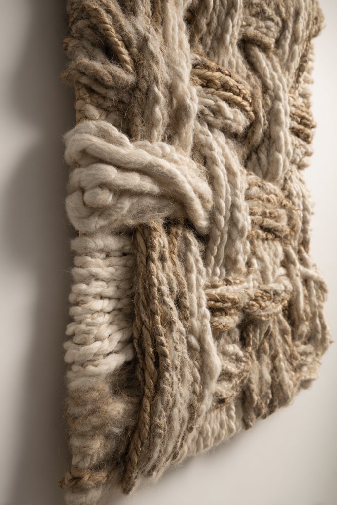 Imagine a large wall hanging made from jute, hemp, or linen strips woven into a geometric or freeform pattern. The fibers’ natural tones—beige, taupe, or rust—add warmth and subtle variation. The weave creates a tactile surface that invites touch and adds visual interest through its rough texture and organic lines. It’s like bringing a piece of the countryside into your living room.