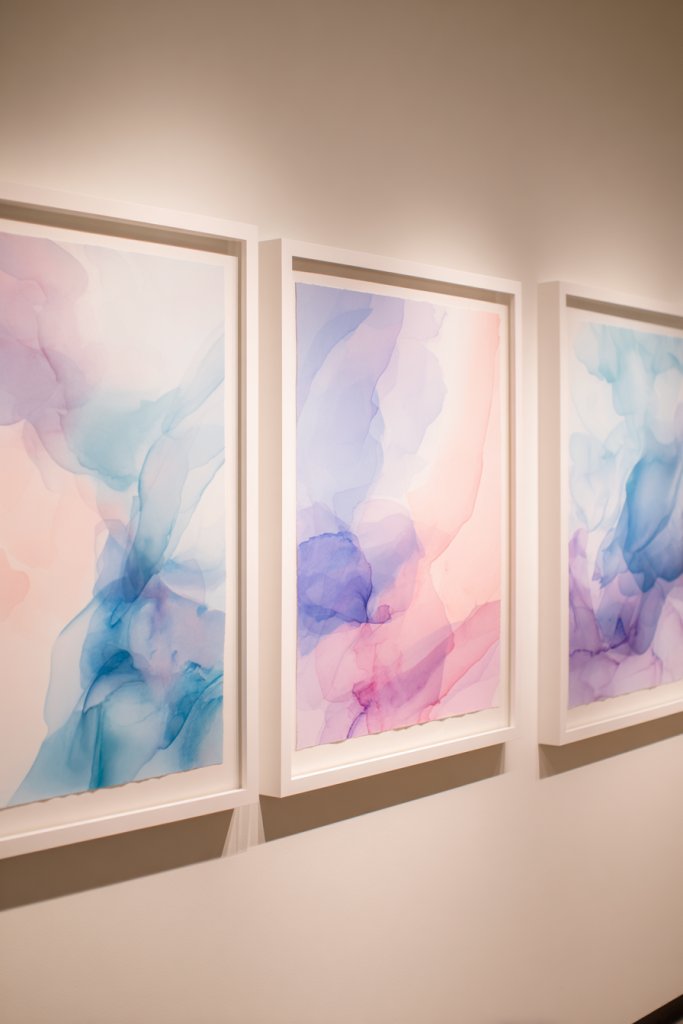 Start with high-quality watercolor paper or canvas. Use a wet-on-wet technique to blend colors smoothly, letting the pigments flow freely. Experiment with different brush sizes and strokes, then let the paintings dry completely. Mount the panels on foam core or wood backing, and arrange them on the wall with even spacing. Use clips or adhesive strips for easy adjustments.
