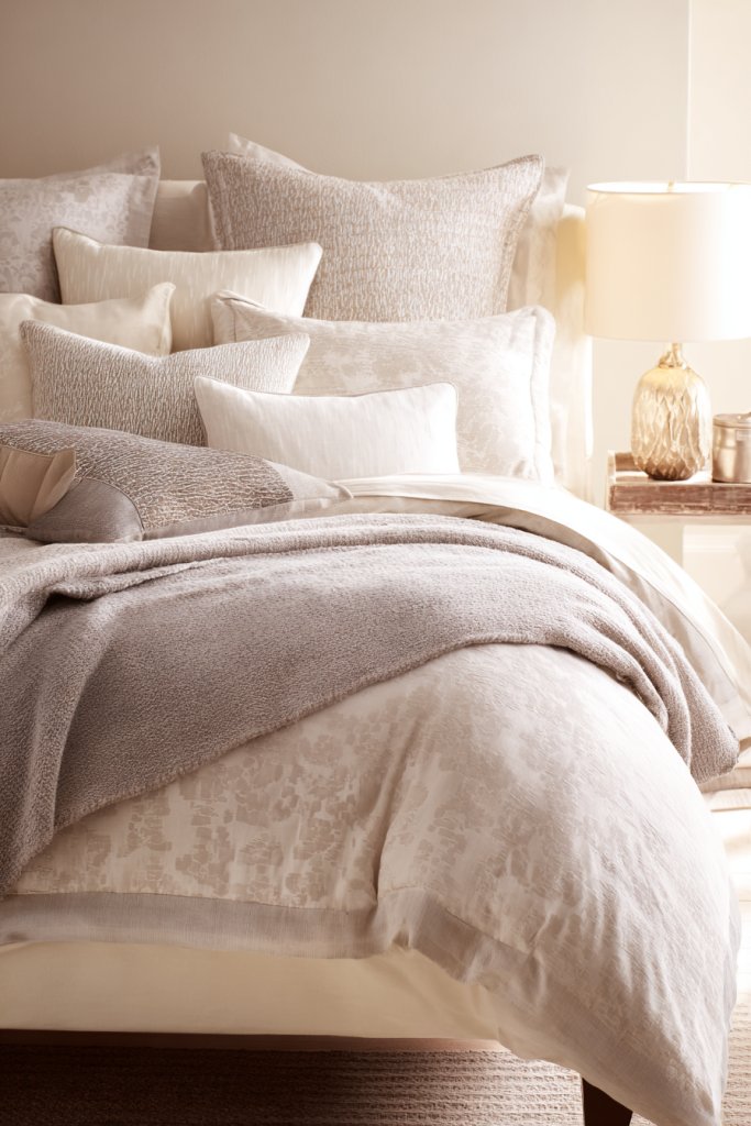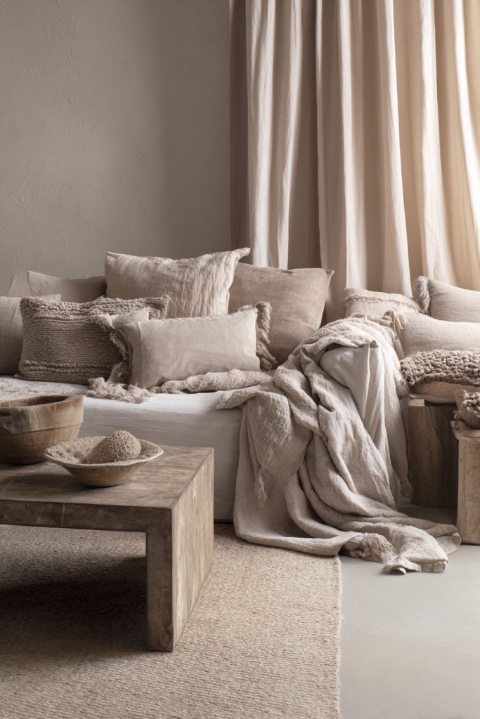 This look can adapt to seasons by swapping out heavier textiles for lighter ones in summer or adding a faux fur throw in winter. Opt for darker hues like charcoal or light creams based on your preference—brighten the room with crisp whites or deepen it with warm browns. For smaller spaces, scale down the textures but keep the layered effect intact. The key is to mix and match different fabrics and patterns for a rich, tactile feel.