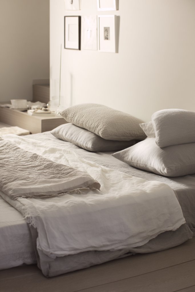 Picture soft shades of gray or blush pink covering the walls, bedding, and furniture. Layer different textures—matte, silk, and linen—to add depth and interest. The bed, dressed in matching monochrome linens, becomes the centerpiece. Gentle lighting, perhaps from wall sconces or a bedside lamp, bathes the room in warm, soothing glow. The overall effect is minimal yet luxurious, inviting sleep and serenity.