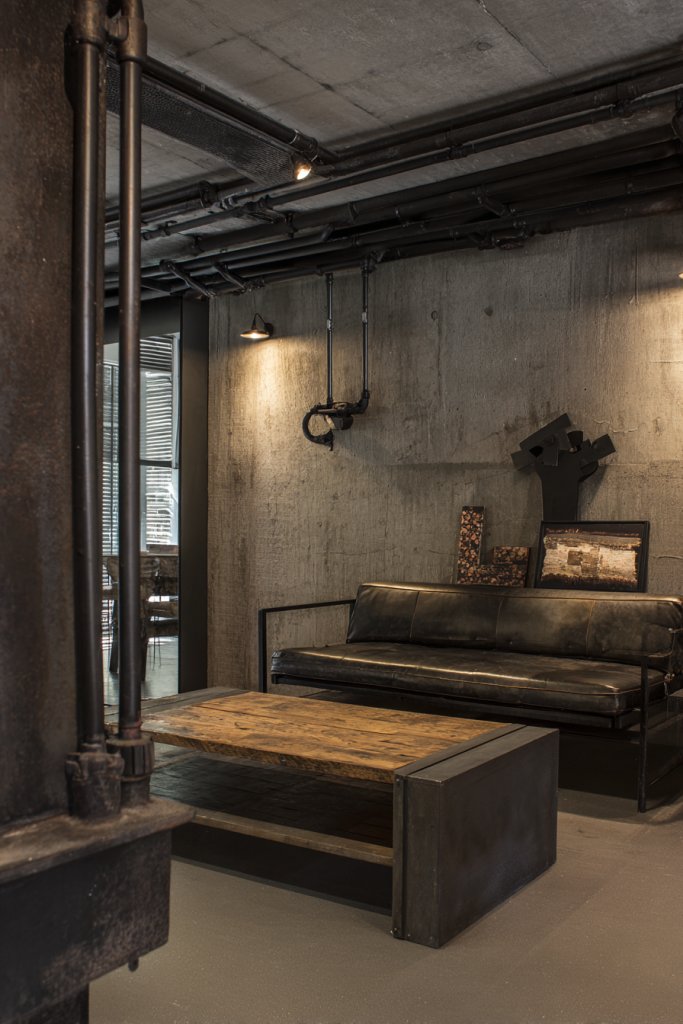 Imagine a living room with black metal pipe shelving holding a mix of books and decorative objects, contrasting with textured concrete walls. Exposed ductwork and pipework are painted in matte black or metallic finishes, adding visual intrigue. The furniture combines wood and metal—like a reclaimed wood coffee table with black iron legs. Warm lighting from industrial-style fixtures adds a cozy glow, softening the raw materials.