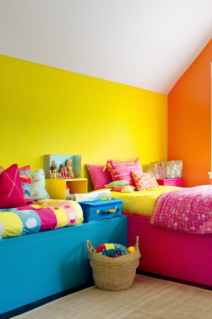 16. Playful Kids’ Room with Bright Colors and Practical Storage