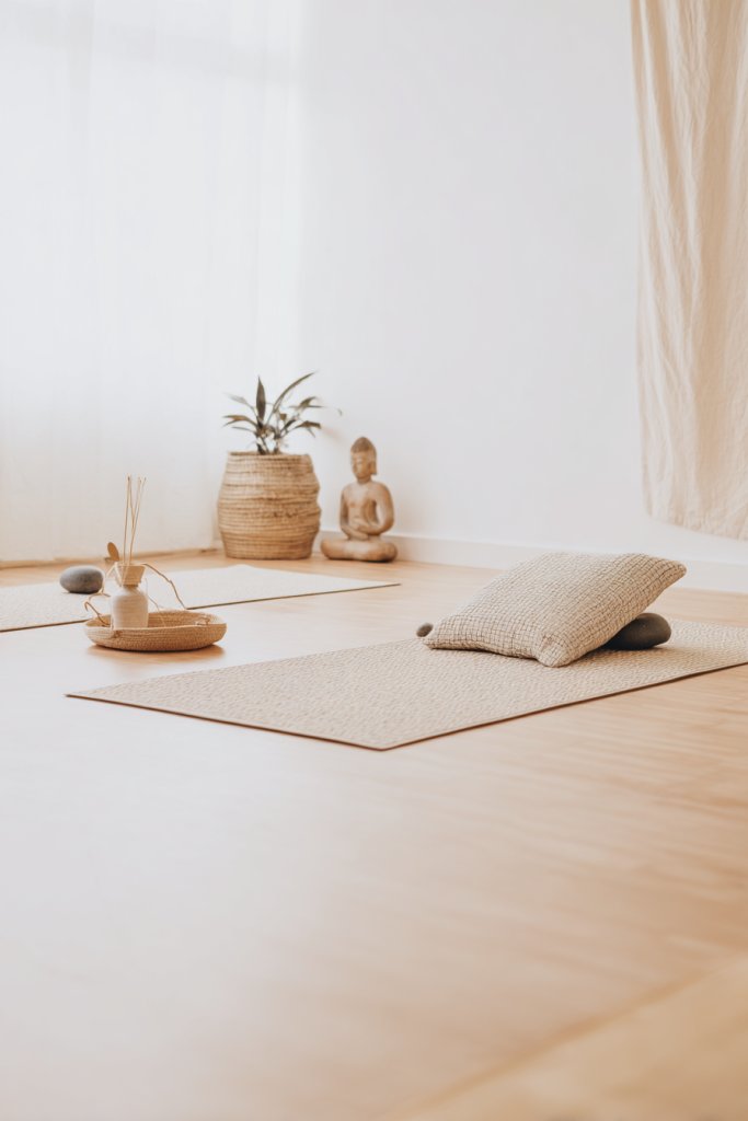 Visualize a quiet corner with a soft, textured mat on natural wooden floors. The space is free of clutter, with a few carefully chosen decor pieces—like a textured linen curtain or a woven basket for essentials. Natural light filters softly through sheer curtains, casting a gentle glow. Subtle accents like a stone sculpture or a simple wooden bench enhance the earthy, calming vibe.