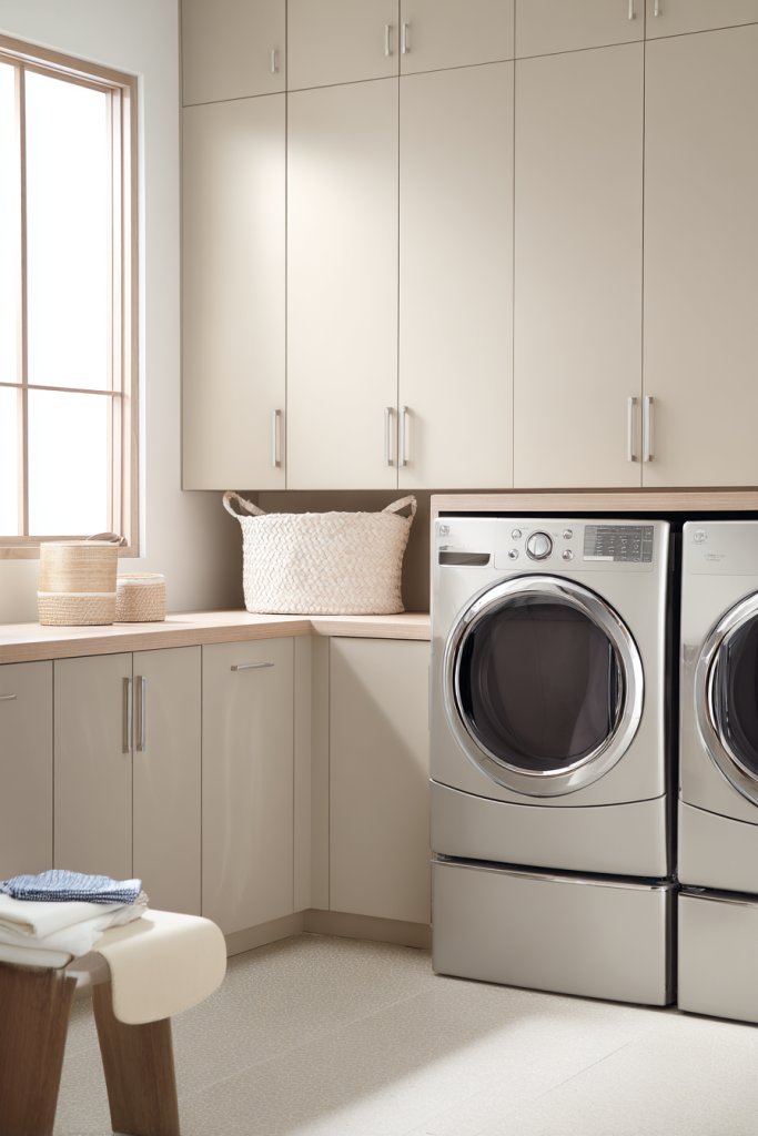 Picture a bright, airy space with open shelving and sleek cabinets in a neutral or matte finish. A durable countertop provides space for folding and sorting clothes, while labeled bins keep small items organized. A wall-mounted drying rack or a pull-out ironing board adds practicality without clutter. The room feels fresh and efficient, with a touch of style that makes laundry less of a chore.