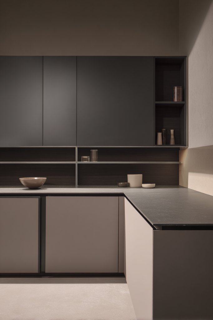Picture a seamless line of matte black cabinets with no visible handles, creating a smooth, uninterrupted surface. The countertops are a matte quartz in a light neutral shade, reflecting soft natural light. Open shelving with minimal decor keeps essentials accessible without clutter. Subtle lighting illuminates the workspace, highlighting the matte textures and clean edges. The overall effect is modern, calm, and highly organized.