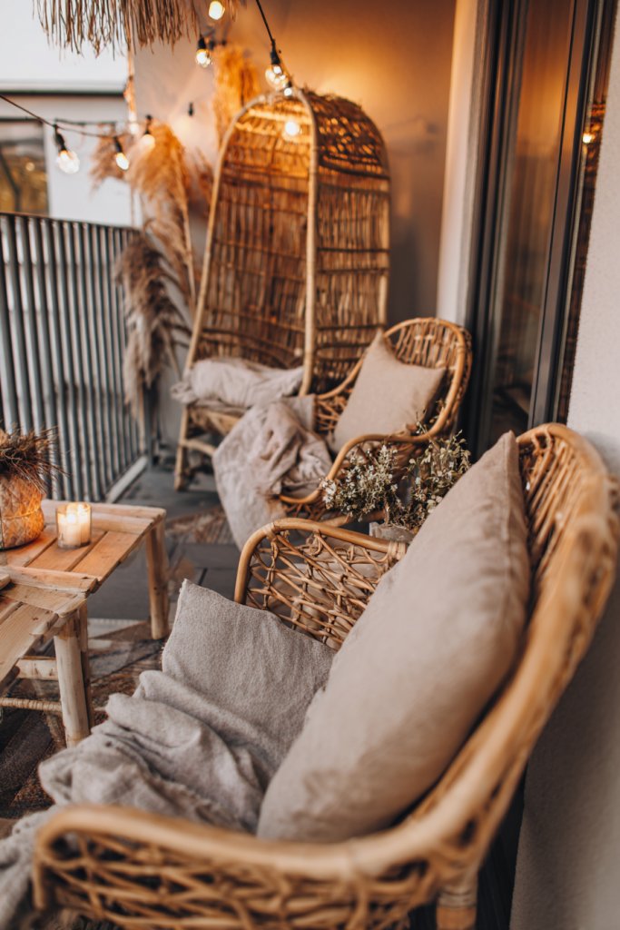 Picture weatherproof furniture, like a rattan loveseat with plush cushions in weather-resistant fabric. Soft textiles such as knitted throws or outdoor rugs add warmth and texture. Ambient lighting, like string lights or lanterns, creates a cozy glow after sunset. Small potted plants or decorative lanterns enhance the space without clutter, transforming a balcony into a relaxing oasis.