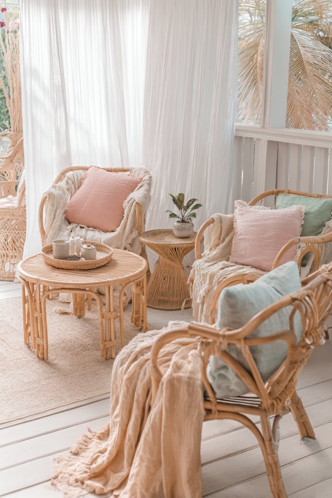 Envision a sunlit room with a rattan loveseat draped with colorful, patterned cushions. Light, airy curtains flutter gently in the breeze, adding a touch of movement. A woven rug covers the floor, while cozy throws and textured pillows invite you to settle in. Natural light floods the space, highlighting the warm tones of rattan and the vibrant textiles, creating a relaxed, stylish atmosphere.
