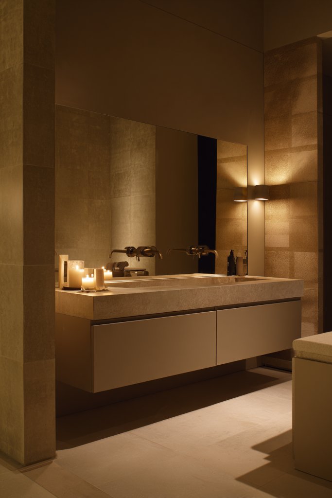 6. Luxurious Bathroom with Floating Vanities and Warm Lighting