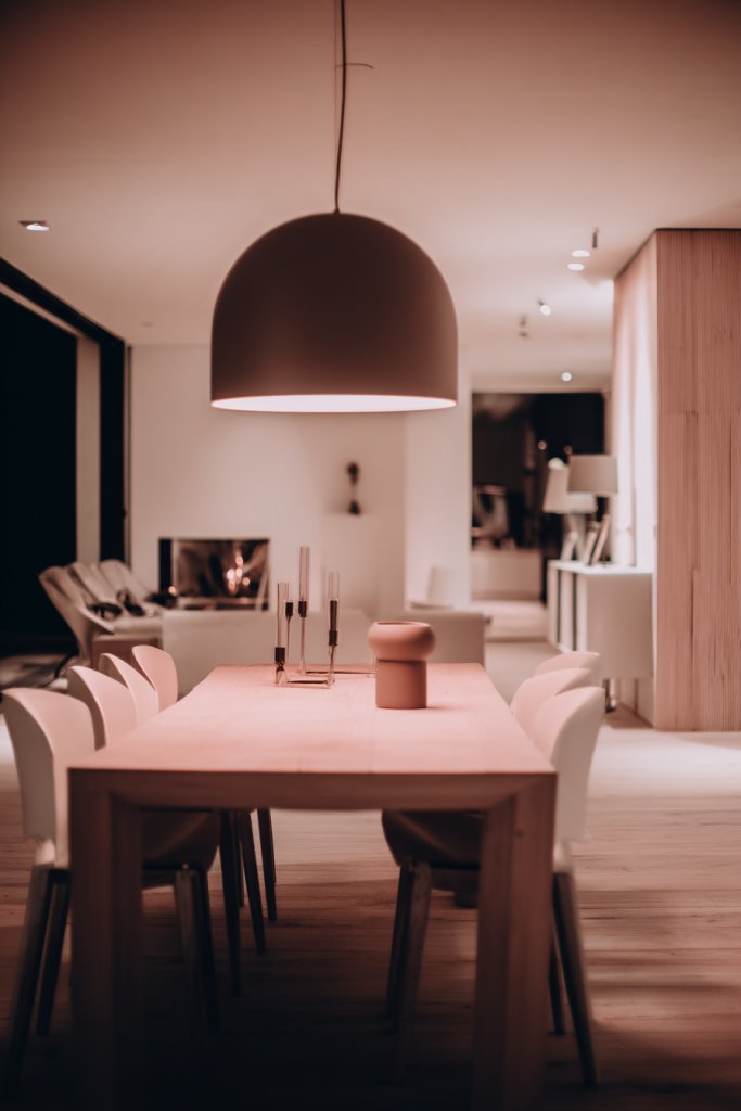 Imagine a large, rustic wooden table paired with modern, upholstered chairs. Overhead, a bold chandelier or pendant light in a striking design hangs, casting a warm glow. The space is open and airy, with natural light flooding in through expansive windows. Ambient lighting complements the statement fixture, creating a layered, inviting environment perfect for entertaining or casual meals.