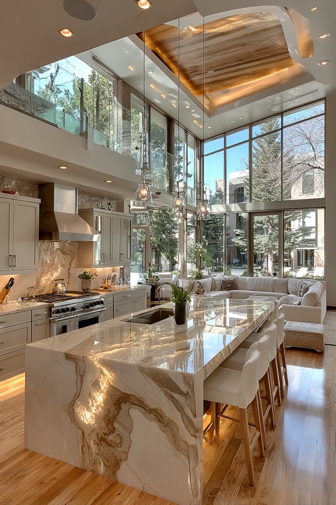 Picture a spacious kitchen where the island acts as a hub, with a sleek marble top and a cozy seating area. Bright natural light floods the space through expansive windows, highlighting the open flow. The island’s surface is busy with fresh ingredients, while pendant lights hang overhead, casting a warm glow. The seamless transition to the living or dining area creates a lively, inviting atmosphere.