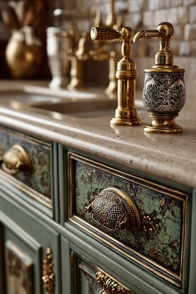 Envision antique brass or distressed nickel handles on cabinets, along with vintage-style faucet fixtures. These elements feature ornate details and a timeless appeal, contrasting beautifully with sleek countertops and modern appliances. The mix of old and new creates a layered, curated look that feels authentic and charming.