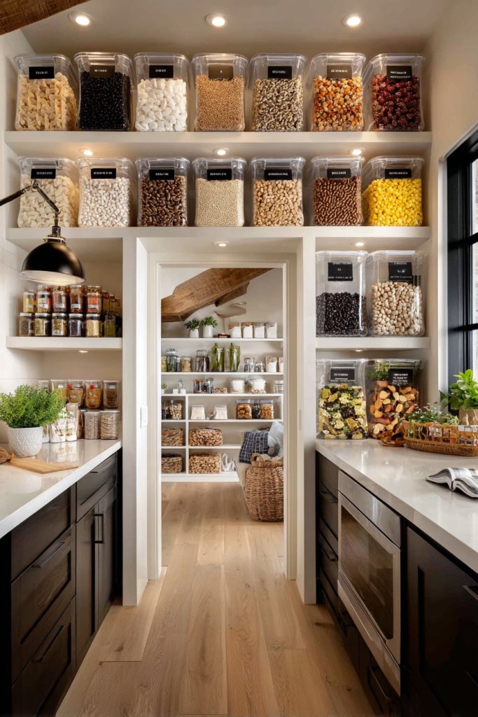 Use uniform containers for a clean, minimalist look, or mix different sizes and shapes for an eclectic vibe. Incorporate baskets or woven bins for softer textures or seasonal items. For small spaces, use vertical stacking or pull-out drawers. Incorporate labels that match your decor, whether modern or rustic.