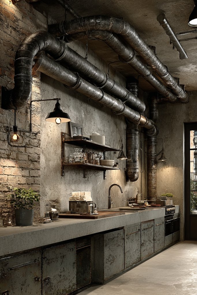 16. Industrial Style Elements with Exposed Pipes and Metal Accents