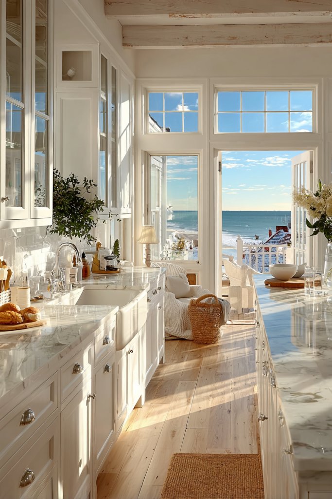 Picture expansive windows flooding the room with natural light, reflecting off white or pastel cabinets and countertops. Pale stone or quartz surfaces add a clean, crisp feel, while light-colored walls and backsplashes enhance the sense of openness. Minimal clutter and sleek fixtures complete the look, making the space feel larger and more inviting.