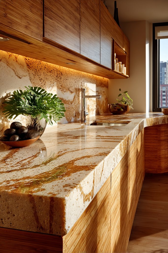 19. Eco-Friendly Materials: Recycled Countertops and Bamboo Cabinets