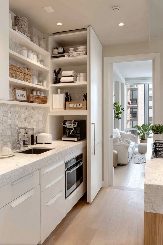 Imagine a galley kitchen with narrow cabinets and pull-out shelves that make use of vertical space. Fold-away appliances and hidden storage keep surfaces clear. Bright, light-colored surfaces reflect light, creating an open feel. Clever organization turns a small footprint into a fully functional cooking zone that feels larger than it is.