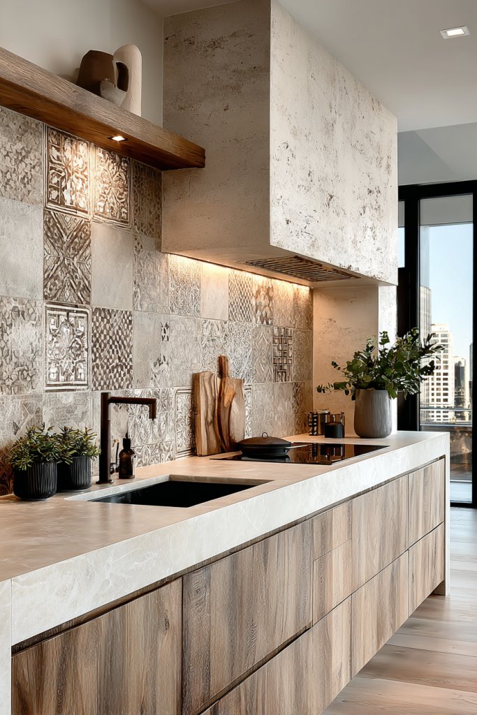 23. Textured Backsplash Tiles with Subtle Geometric Patterns
