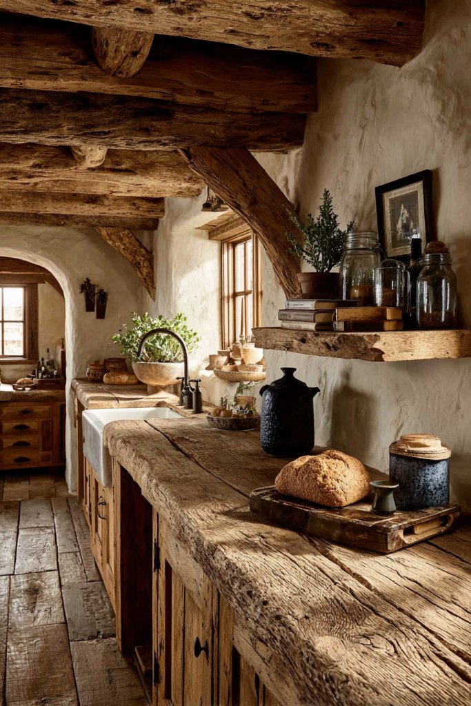Visualize exposed wooden beams overhead, their natural knots and textures adding character against crisp painted walls. Open shelves display charming dishware, vintage jars, and woven baskets, making everything accessible and pretty. The warm tones of aged wood contrast beautifully with sleek countertops, creating a layered, textured look. Soft, ambient lighting highlights the rustic details and adds cozy ambiance.