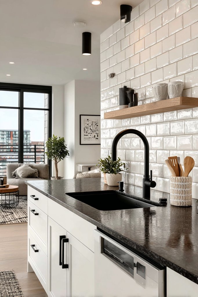 Imagine a backsplash of crisp white subway tiles stretching behind your stove, their glossy surface catching the light. Matte black fixtures like faucet handles, cabinet pulls, and lighting contrast sharply with the tiles, adding depth and sophistication. The overall effect is a sleek, monochrome palette that feels airy and expansive. The subtle texture of the tiles combined with the matte finish creates a tactile, inviting vibe.