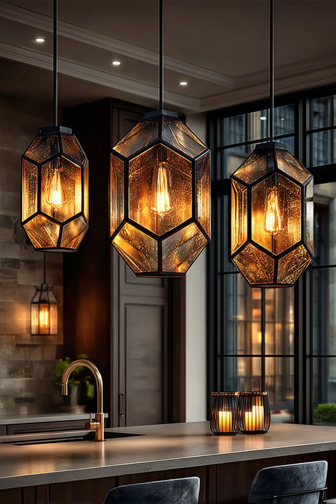 Picture a row of large, sculptural pendants hanging above a sleek island. The fixtures feature intricate metalwork or colorful glass shades, casting beautiful shadows and ambient light. The glow highlights the island’s surface, creating a cozy yet chic vibe. The mix of textures and shapes adds depth and visual interest, making the entire area feel curated and lively.