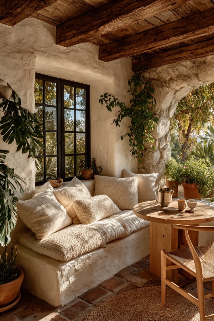 Picture a corner with a padded bench fitted into a nook, upholstered in soft fabric and topped with colorful cushions. A small round or rectangular table sits in front, perfect for breakfast or casual snacks. Bright curtains frame a window, flooding the space with natural light. The combination of textiles, wood, and soft lighting makes this spot a favorite in the house.