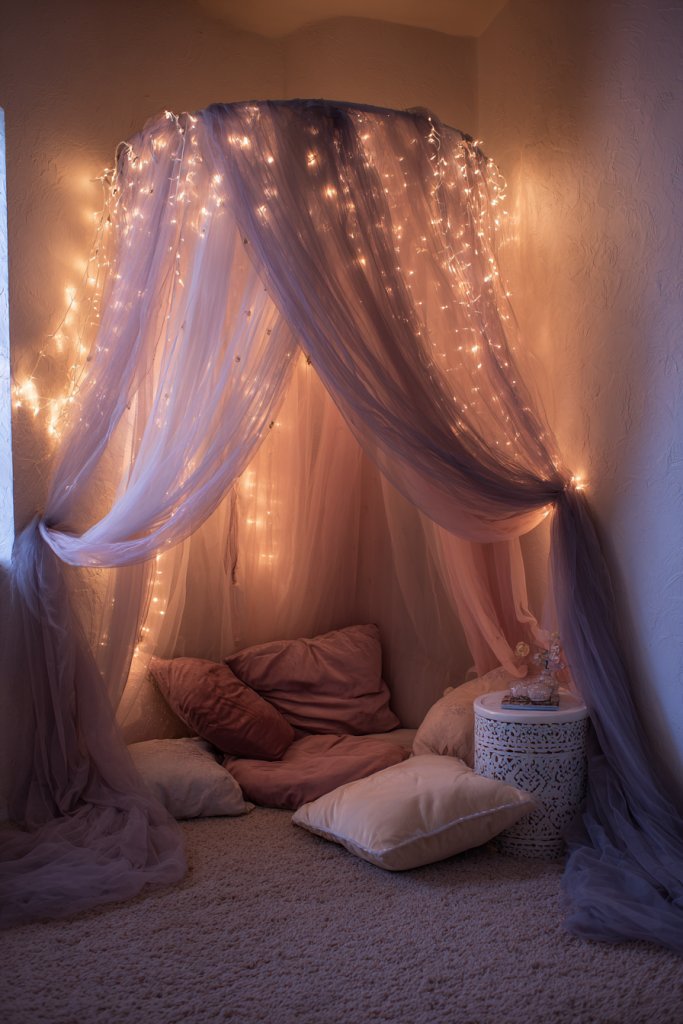 1. Fairy Tale Canopy Nook with Flowing Fabrics and Twinkle Lights