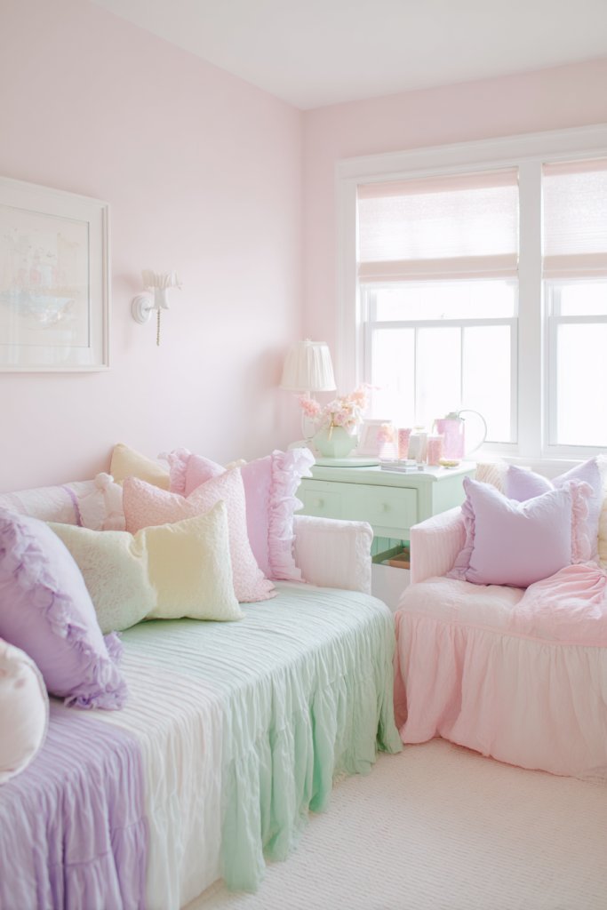 Visualize walls painted in blush pink or lavender, complemented by cushions, curtains, and accessories in coordinating shades. Light mint green and sky blue add a fresh, cheerful touch. The overall effect is soothing yet playful, inviting you to relax and unwind. Textured fabrics, such as linen or embroidered details, enhance the softness, while subtle accents like gold or silver trim add a touch of elegance. The space feels delicate, harmonious, and full of whimsy.