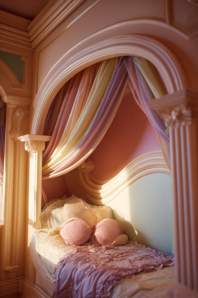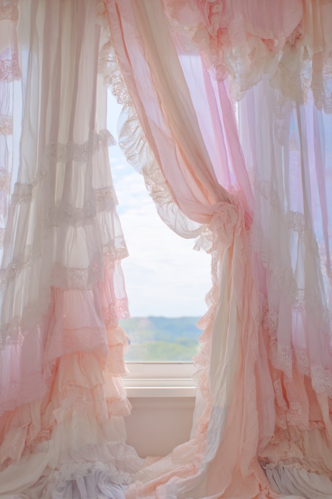 Envision sheer, ruffled curtains in pastel shades gently billowing in the breeze. Layered with heavier, patterned drapes, they create depth and a fairy-tale feel. The soft folds and delicate textures catch the light, casting gentle shadows across the room. Adding tiebacks in whimsical shapes or floral accents enhances the layered look, making windows a focal point of magic and softness.