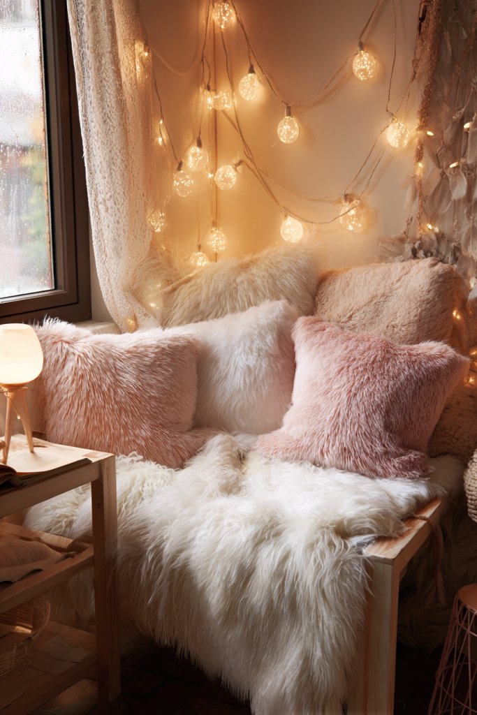 16. Cozy Reading Nook with Faux Fur Pillows and String Lights