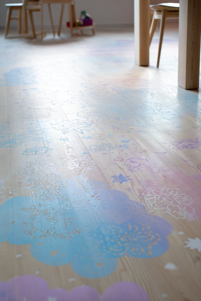 Imagine a wooden floor adorned with soft, cloud-shaped patterns in pastel shades or subtle star motifs. The paint might shimmer slightly in the light, adding a magical glow. The design is delicate and playful, creating a soft foundation that complements your decor. When paired with plush rugs and layered textiles, the floor becomes part of a dreamy landscape that invites relaxation and imagination.