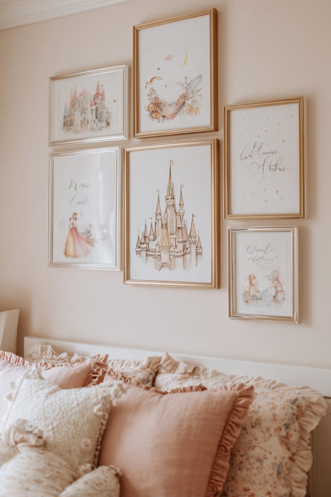 Picture framed prints of unicorns, castles, or dreamy landscapes arranged in playful groupings. Alternatively, quotes in whimsical fonts are surrounded by doodles or decorative borders. The colors might be soft pastels or vibrant hues, depending on your style. These prints add a personal touch, creating focal points that inspire and delight. The overall effect is a curated gallery of fantasy and positivity.