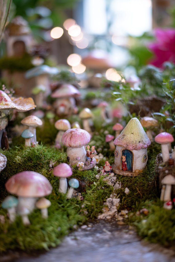 Visualize a small glass terrarium or shallow planter filled with lush moss, tiny ceramic mushrooms, and miniature fairy houses. Decorative pebbles and tiny lanterns add to the enchanted woodland feel. The miniature fungi and figurines create a playful, magical scene that invites curiosity. When lit with soft LED lights or fairy lights, it feels like a secret fairy realm hiding in plain sight.