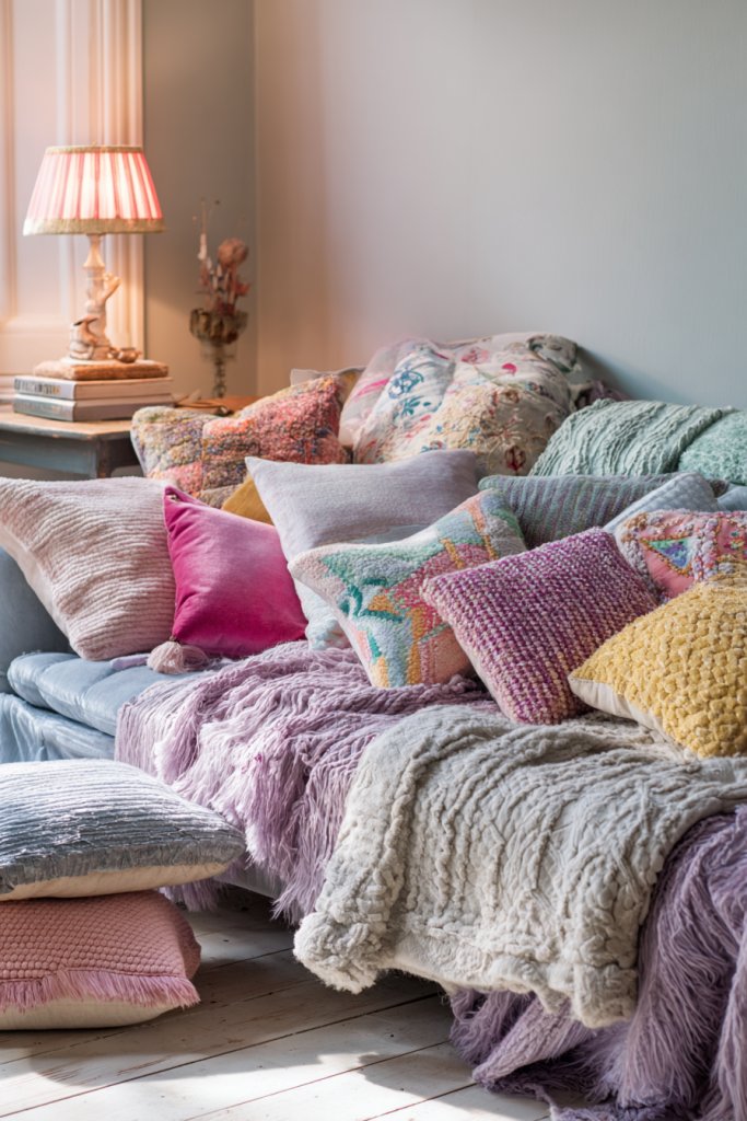 Visualize a collection of cushions in different shapes, sizes, and fabrics—think sequined, velvet, or embroidered. Mix in some faux fur throws or knitted blankets for extra texture. The colors might range from soft pastels to bold jewel tones, creating a playful yet harmonious palette. Arranged thoughtfully, they create a cozy nest that beckons you to relax and unwind. The combination adds depth and personality, making the space uniquely yours.