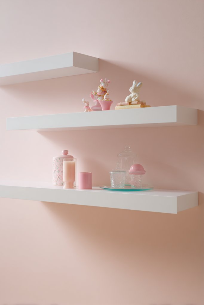 Imagine a series of white or pastel-colored floating shelves arranged asymmetrically along a wall. On them, you showcase tiny vintage trinkets, miniature figurines, or charming collectibles—nothing too bulky, just enough to spark curiosity. Soft lighting underneath or spotlights highlight these curated pieces, creating a gallery-like effect. The overall look feels curated, playful, and full of personality, transforming a blank wall into a whimsical focal point.