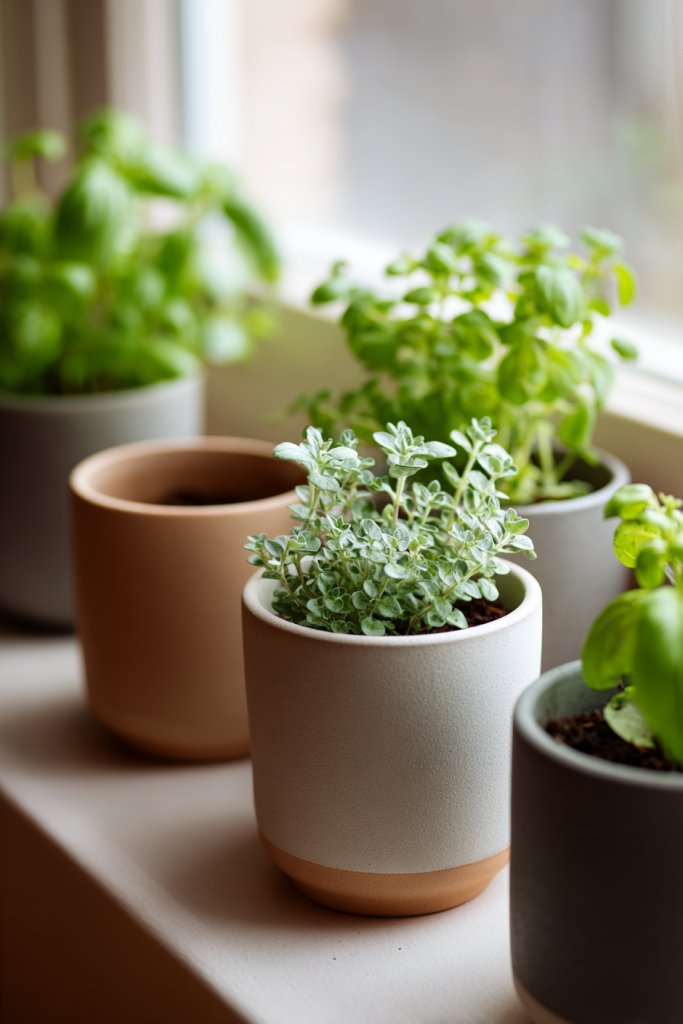 Visualize simple ceramic or terracotta pots in neutral tones—beige, taupe, or muted green—placed on open shelves or countertops. They hold tiny herbs like basil or thyme, or drought-tolerant succulents with sculptural shapes. The minimal design emphasizes natural textures and colors, blending seamlessly with wood and stone surfaces. These small pops of green inject vitality without clutter.