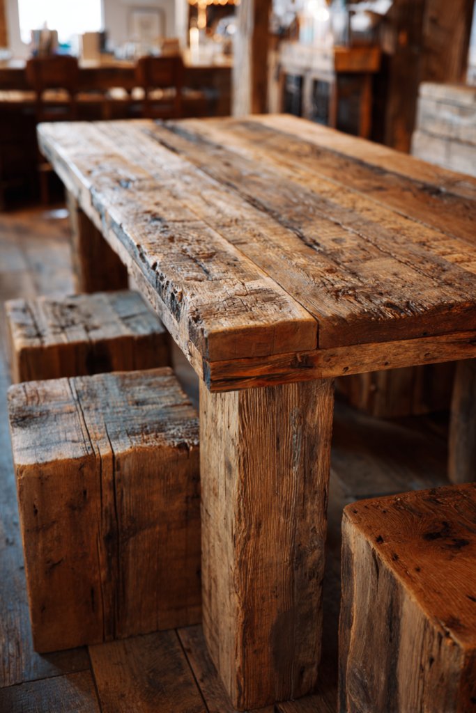 Picture a rustic, weathered table with visible knots and grain, paired with matching stools in a distressed finish. The natural imperfections tell stories of previous lives and add charm. The warm, uneven tones complement earthy walls and stone countertops, creating a cozy, inviting vibe. These pieces evoke a sense of craftsmanship and sustainability.