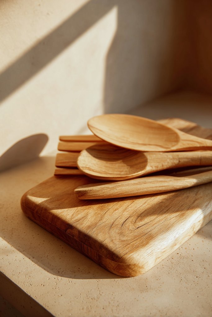 Visualize smooth, rounded spoons, spatulas, and chopping boards in warm woods like cherry, maple, or walnut. The natural grain patterns and hand-carved details showcase craftsmanship. These pieces look beautiful on open shelves or countertop displays, turning utilitarian objects into art. Their tactile quality invites you to touch and use them daily.