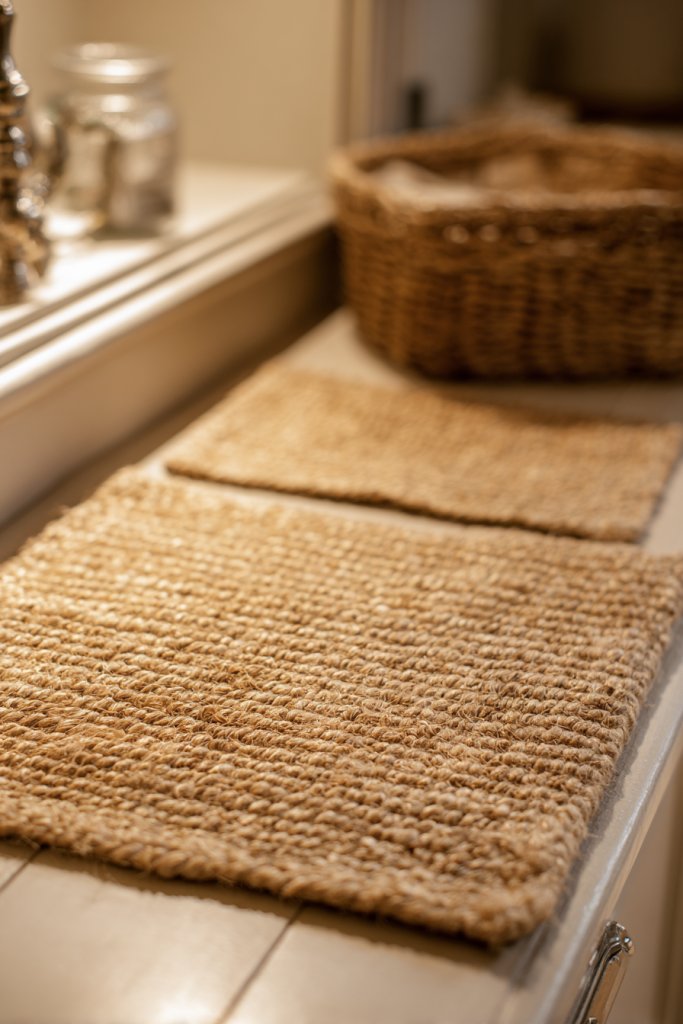Imagine a coir mat with a woven, textured surface in muted beige or tan, placed near the sink or doorway. The natural fibers have a rough, tactile appeal that contrasts beautifully with smooth stone or wood floors. Layered rugs or mats create depth, and their imperfect edges reinforce the organic aesthetic. They absorb sound and add visual warmth.