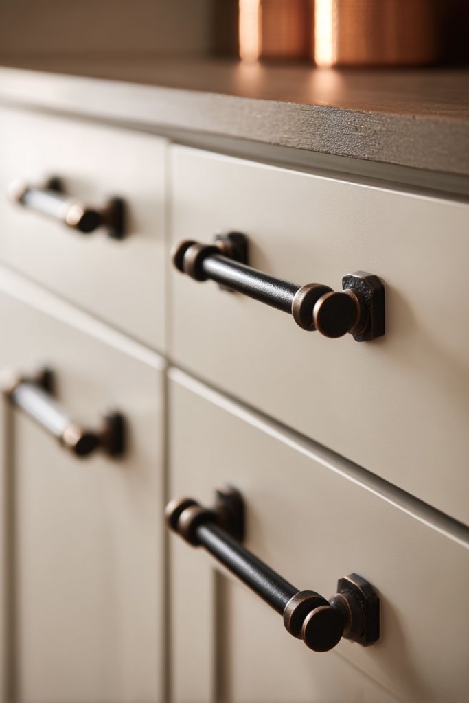 Visualize sleek, brushed metal handles and knobs with simple, clean lines—avoiding unnecessary embellishments. The warm tones of bronze or copper develop a natural patina over time, adding character. Fixtures mounted on rough-textured wooden cabinets or matte stone countertops look effortless and harmonious. Their subtle sheen complements organic textures without overpowering them.