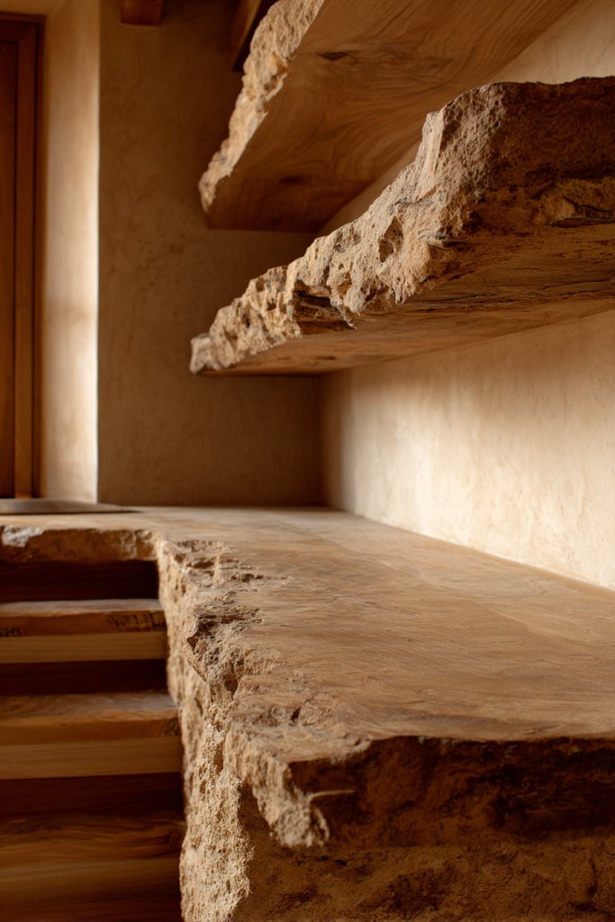 Picture floating wooden shelves with rough, chipped, or uneven edges that highlight the natural shape of the wood. Countertops with chipped or jagged edges have a tactile, rustic appeal that invites touch. These unrefined details contrast with smooth walls or sleek fixtures, creating a layered, organic aesthetic. The raw edges add visual interest and authenticity.