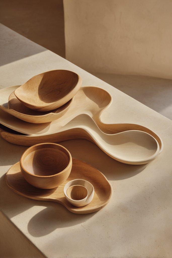 Select items with rounded, asymmetrical, or flowing forms made from natural materials—clay, wood, or stone. Mix sizes and shapes to create visual interest. Incorporate sculptural or functional pieces—like rounded bowls or flowing trays—that serve practical purposes while acting as decor. Seasonal or thematic updates can involve adding textured or painted accents.